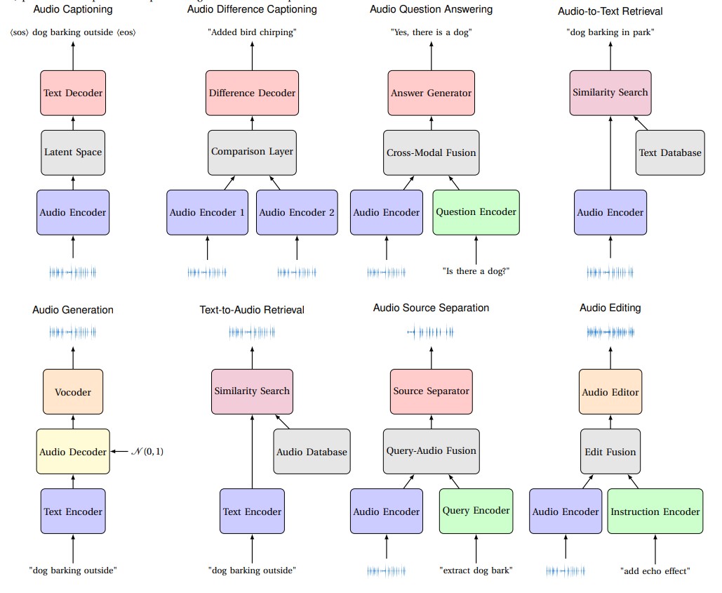 音訊問答(Audio Question Answering, AQA)是「音訊-語言」任務中的一項具體應用。圖 1 展示了「音訊-語言」資料集中常見的八大應用類型[4],而其中之一即為 AQA 任務,專注於「音訊 + 問句 → 自然語言回答」的互動形式,透過「針對某段音訊回答一個問題」的操作方式包裝模型。 問答範例如下: