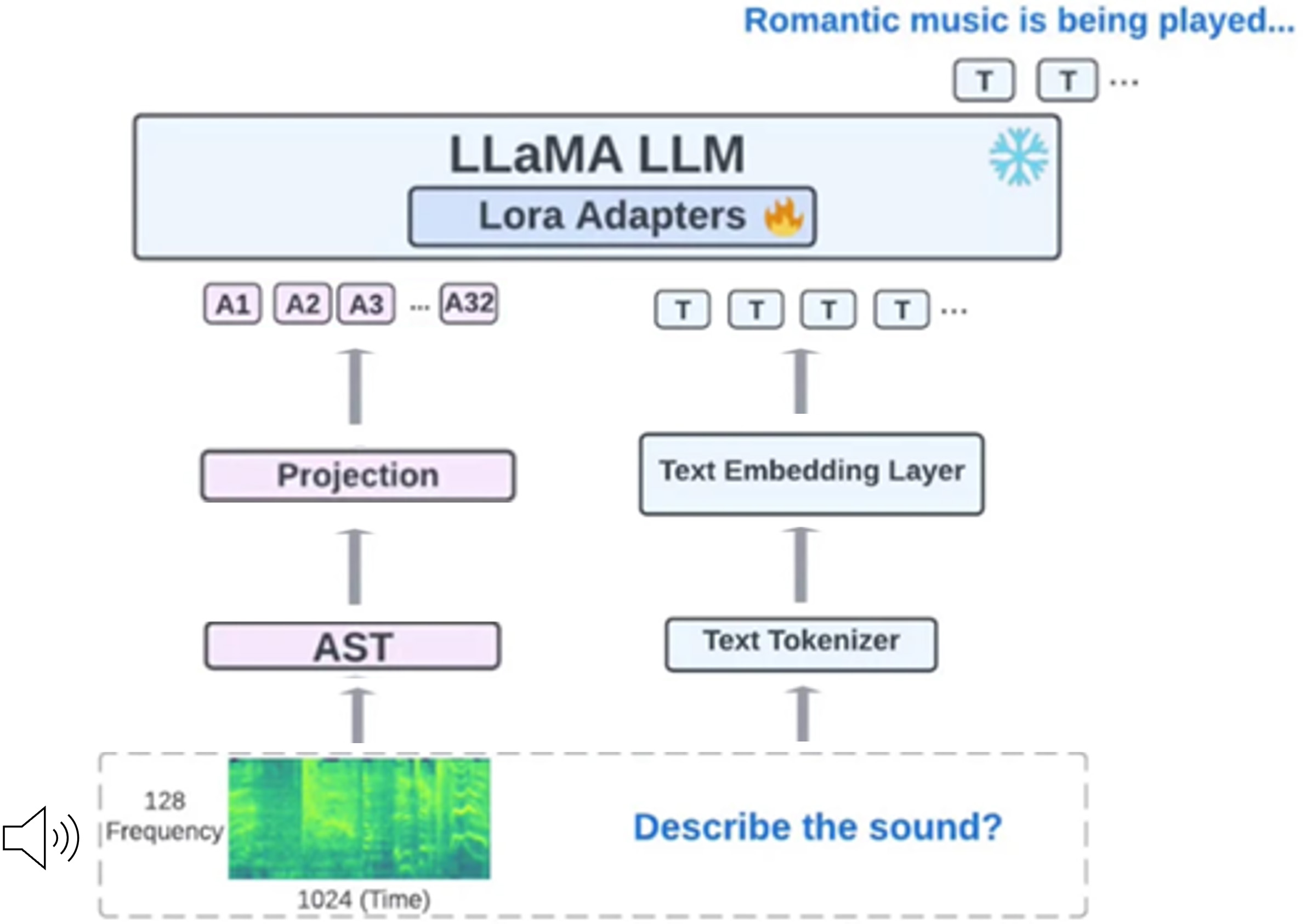 音訊問答(AQA)是一種應用任務,而要達成這項任務,必須依賴Audio LLM這類多模態模型,透過它實現整合音訊與語言理解並生成答案,簡言之,Audio LLM是支撐AQA任務的核心技術。Audio LLM技術的動機源自於將聲音分類模型與大型語言模型(LLM)的優勢結合在一起。聲音分類模型在處理音頻數據方面具有卓越的能力,能夠有效地識別和分類不同的聲音類型,如車聲、雨聲、人聲等,具備「聆聽」的能力。而大型語言模型則在自然語言處理上展現出強大的「思考」和「理解」的能力,例如可說明不同犬種吠聲的辨識方法,從聲學特徵之頻率及持續時間等差異區分。若能將這兩者結合在一起,則能補足彼此缺乏的能力,不但擁有聲音感知能力(聆聽),還能夠進一步理解這些聲音在場景中的意義(思考和理解),並生成相應的文本描述。