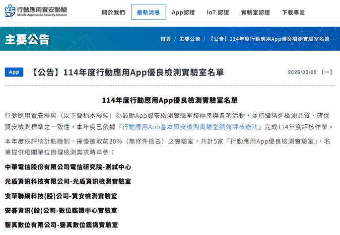 近日行動應用資安聯盟(Mobile Application Security Alliance, MASA)公告中華電信研究院榮獲2025年「行動應用App優良檢測實驗室」殊榮,此項榮譽不僅象徵中華電信長期深耕行動資安領域獲得高度肯定,更彰顯其協助政府與企業推動數位轉型、強化行動應用安全水準的卓越成效。