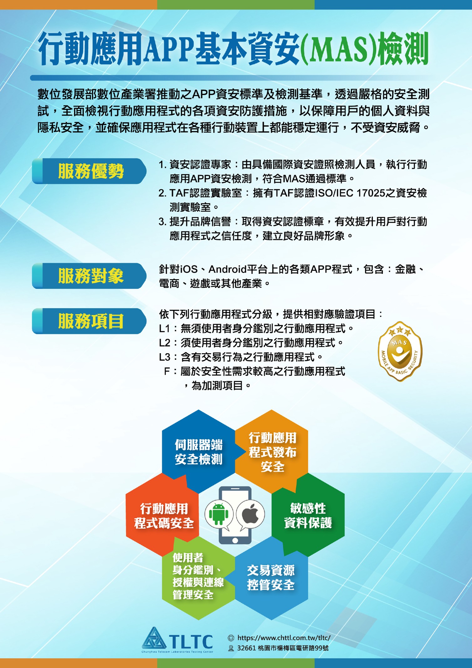 中華電信研究院測試中心具備近十年的深厚實務經驗,不僅取得全國認證基金會(TAF)的 ISO/IEC 17025 實驗室國際認證,更嚴格遵循國家「行動應用App基本資安規範」執行深度檢測,擁有技術頂尖且具備高度公信力的資安菁英團隊。